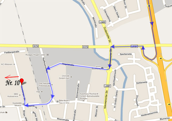 von der A3 kommend aus Richtung Frankfurt:Abfahrt Rodgau / Weiskirchen nehmen auf die Bundesstr. 45